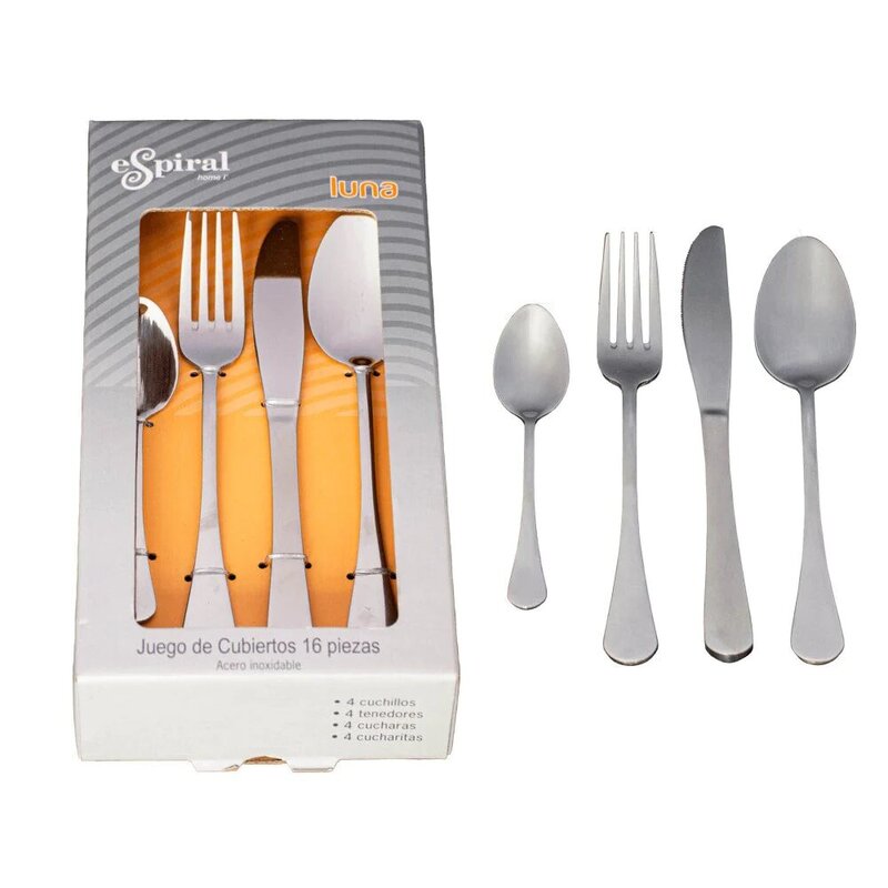 Juego de cubiertos en acero inoxidable. 16 piezas 4 puestos. Incluye 4 cucharas soperas 4 tenedores 4 cuchillos 4 cucharitas postre. El acero inoxidable es altamente resistente a las manchas y la corrosión. Cuando lave a mano, utilice agua caliente con detergente líquido preferiblemente y enjuague minuciosamente. Recuerde, no utilizar esponjas abrasivas o virutillas.