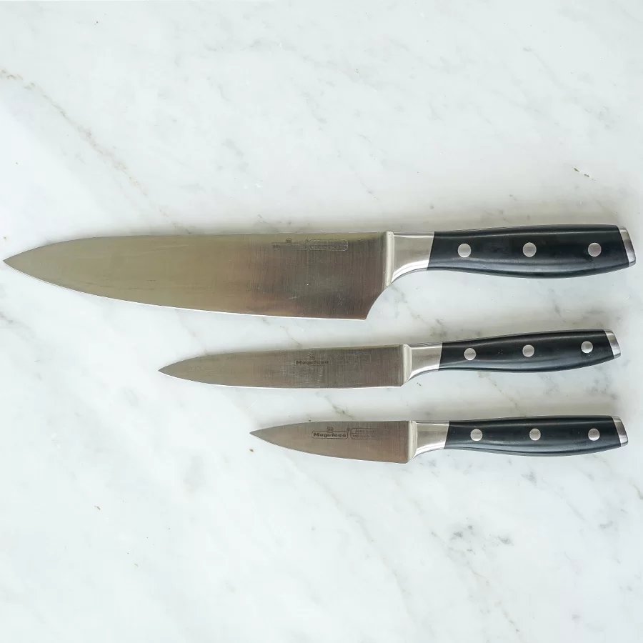 Este maravilloso juego de ollas posee una hoja de una sola pieza elaborada en acero inoxidable forjado alto en carbón, que garantiza una mayor resistencia y durabilidad. Los cuchillos poseen una alta dureza HRC 55+/-2 que conserva el filo por más tiempo. Incluye: cuchillo cocinero 8″; de cocina 5″ y mondador 3,5″.