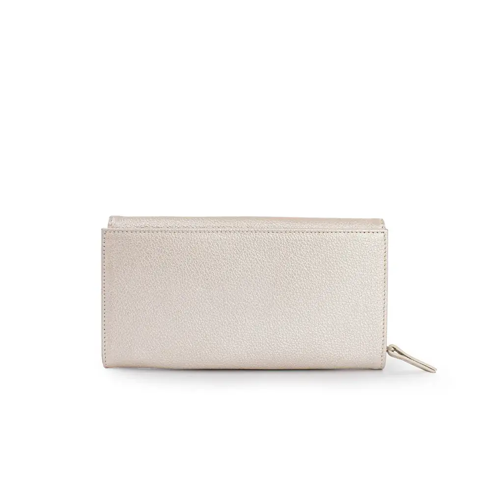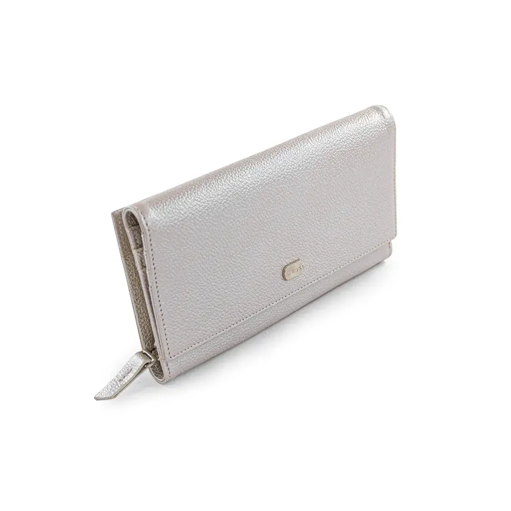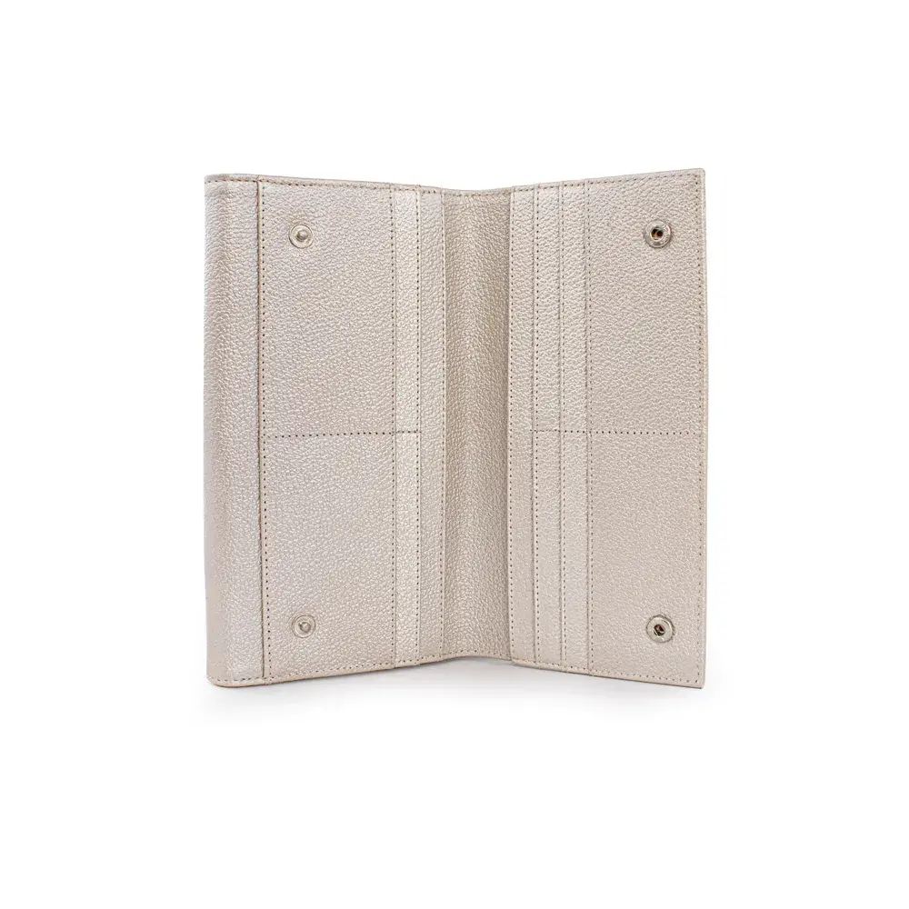 Su textura sofisticada y acabado minimalista lo convierten en un accesorio atemporal y versátil. Cuenta con múltiples compartimentos interiores que facilitan la organización de tarjetas y billetes con total seguridad. El cierre de solapa con broche aporta un toque clásico, mientras que el cierre lateral con cremallera añade practicidad adicional.