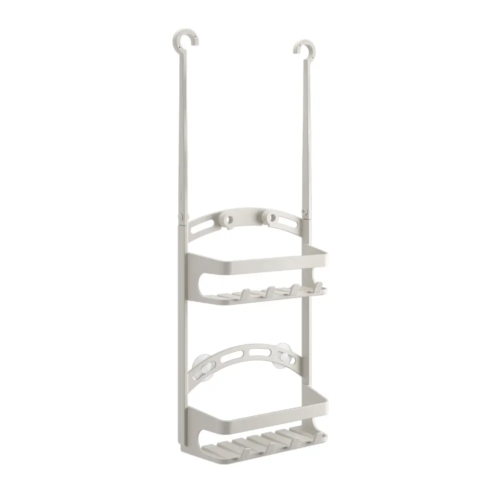 Con un diseño práctico, este organizador de ducha está fabricado en plástico resistente y cuenta con ganchos superiores que le permiten colgarse de forma segura. Presenta dos niveles de estanterías, con una superficie de rejilla que facilita el drenaje del agua y ganchos adicionales para colgar esponjas o cepillos.