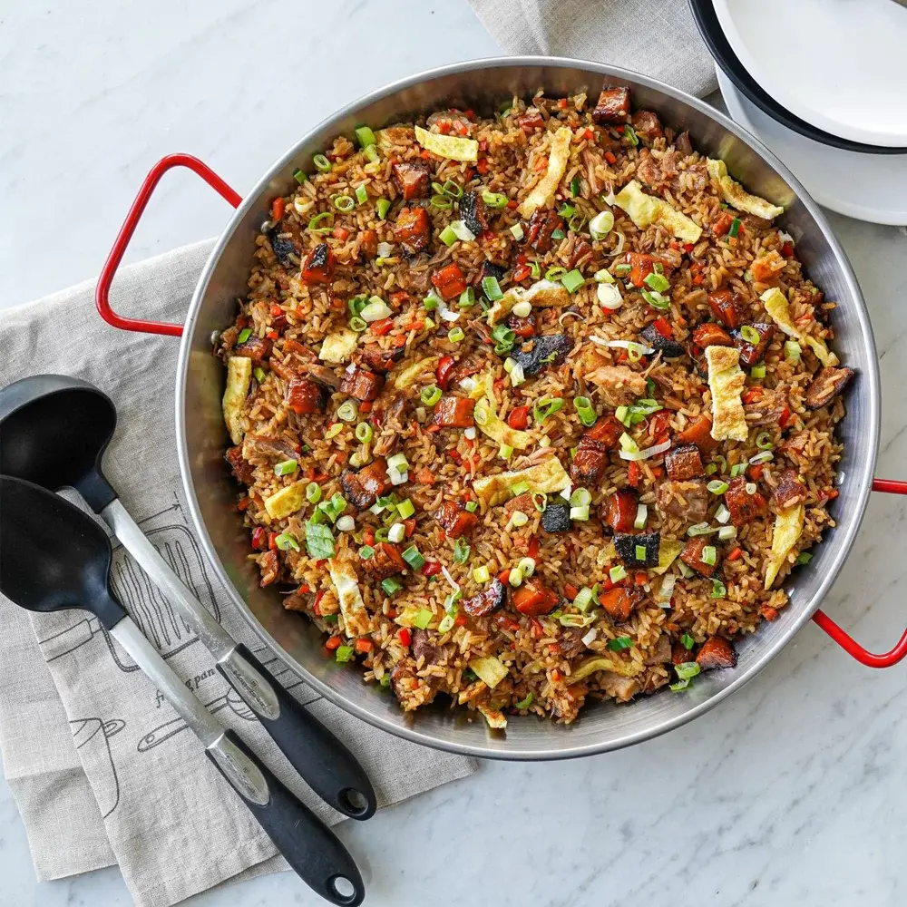 Perfecto para preparar una auténtica paella española, gracias a su diseño amplio y plano que asegura una distribución uniforme del calor. Fabricada con materiales de alta calidad, como acero inoxidable o aluminio, es ideal para cocinar arroz, mariscos, carnes y vegetales, logrando la textura y sabor perfectos en cada plato.