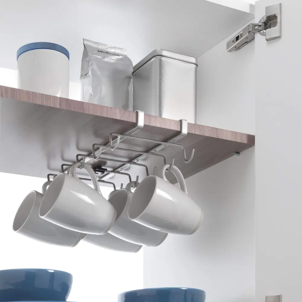 Este organizador se adapta fácilmente a la parte inferior de los estantes, creando espacio adicional para almacenar hasta 10 tazas, mientras que su estructura de alambre resistente, con recubrimiento Polytherm que lo protege contra el óxido, lo convierte en un accesorio ideal para organizar la cocina y optimizar el espacio.