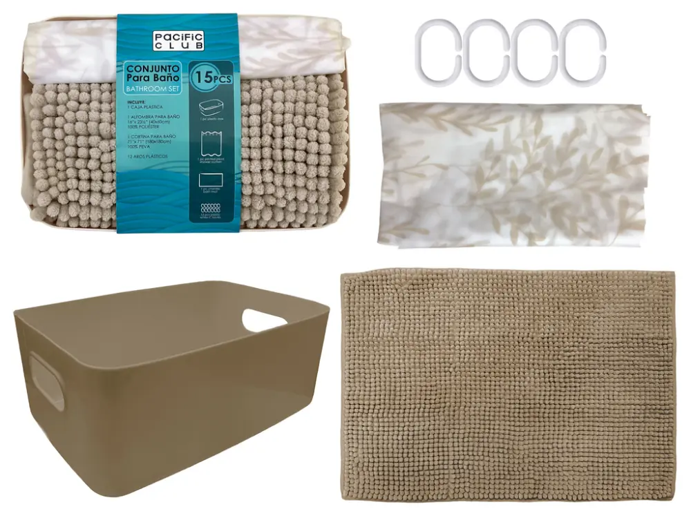 Diseñado para proporcionar comodidad y estilo a su baño. La alfombra, de alta calidad, ofrece una superficie suave y antideslizante, mientras que la cortina, confeccionada con material resistente al agua, garantiza durabilidad y protección.