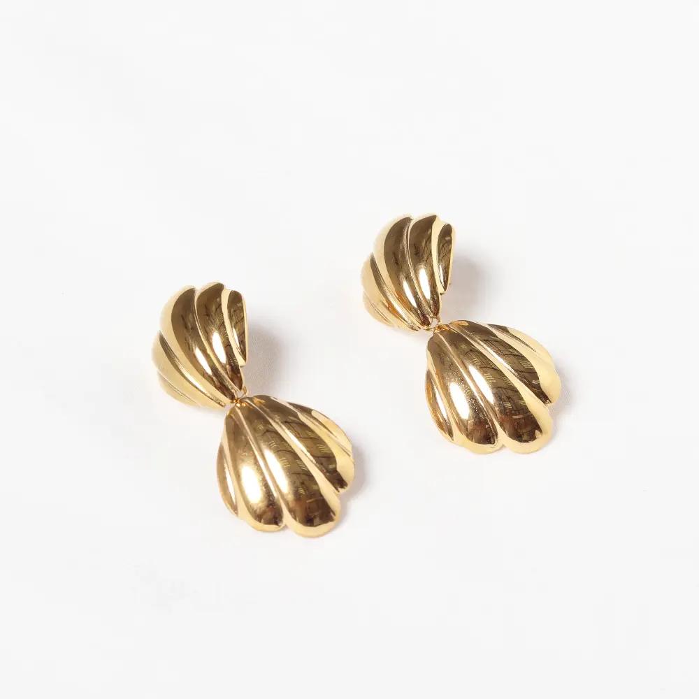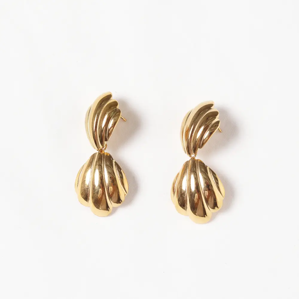 Con un diseño moderno, estos zarcillos presentan una forma inspirada en conchas, con una parte superior que se curva y pliega sobre sí misma, de la cual cuelga una sección inferior abombada con un acabado estriado. Su diseño con movimiento los convierte en un accesorio distintivo, perfecto para añadir un toque de originalidad a cualquier look.